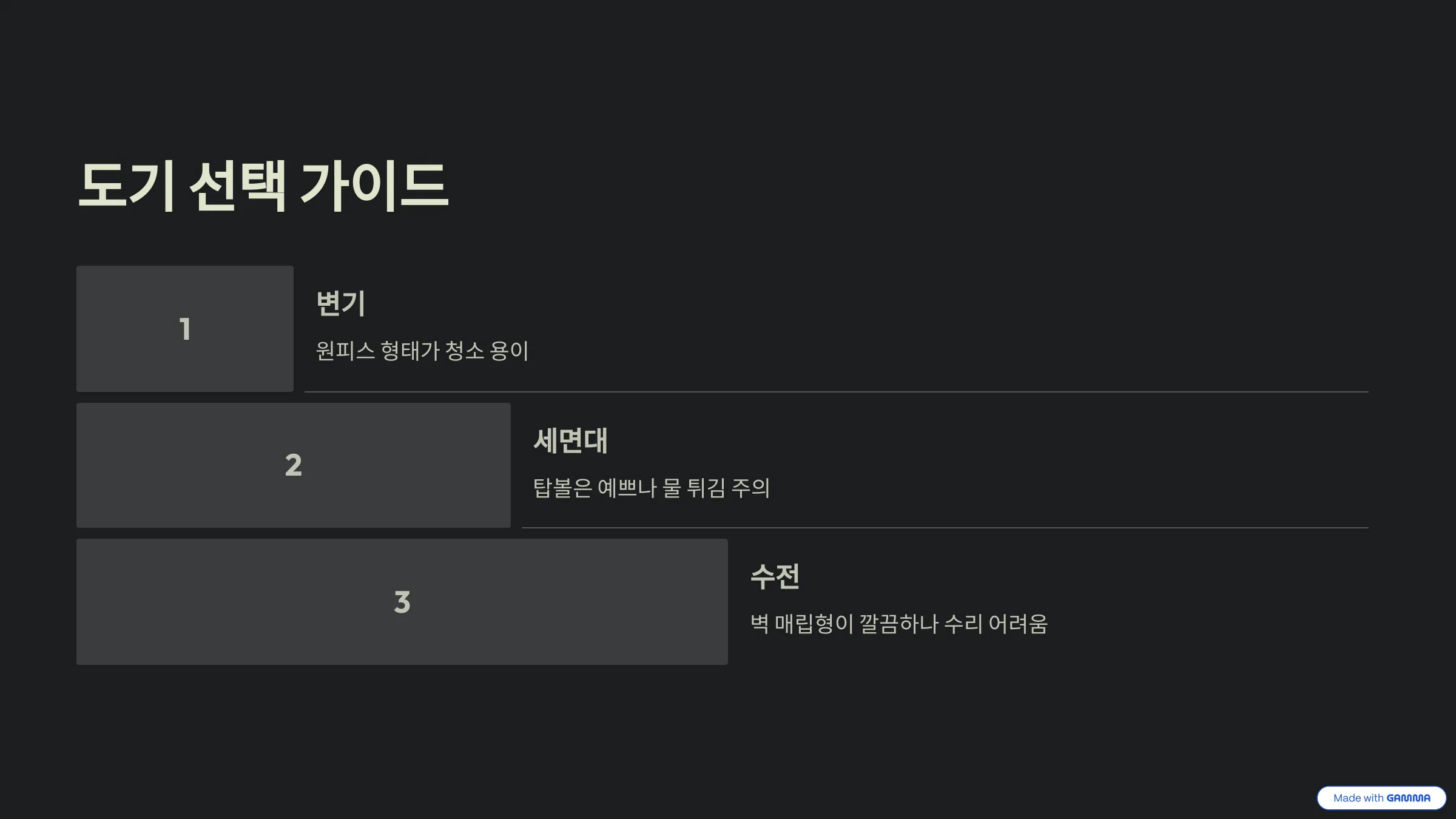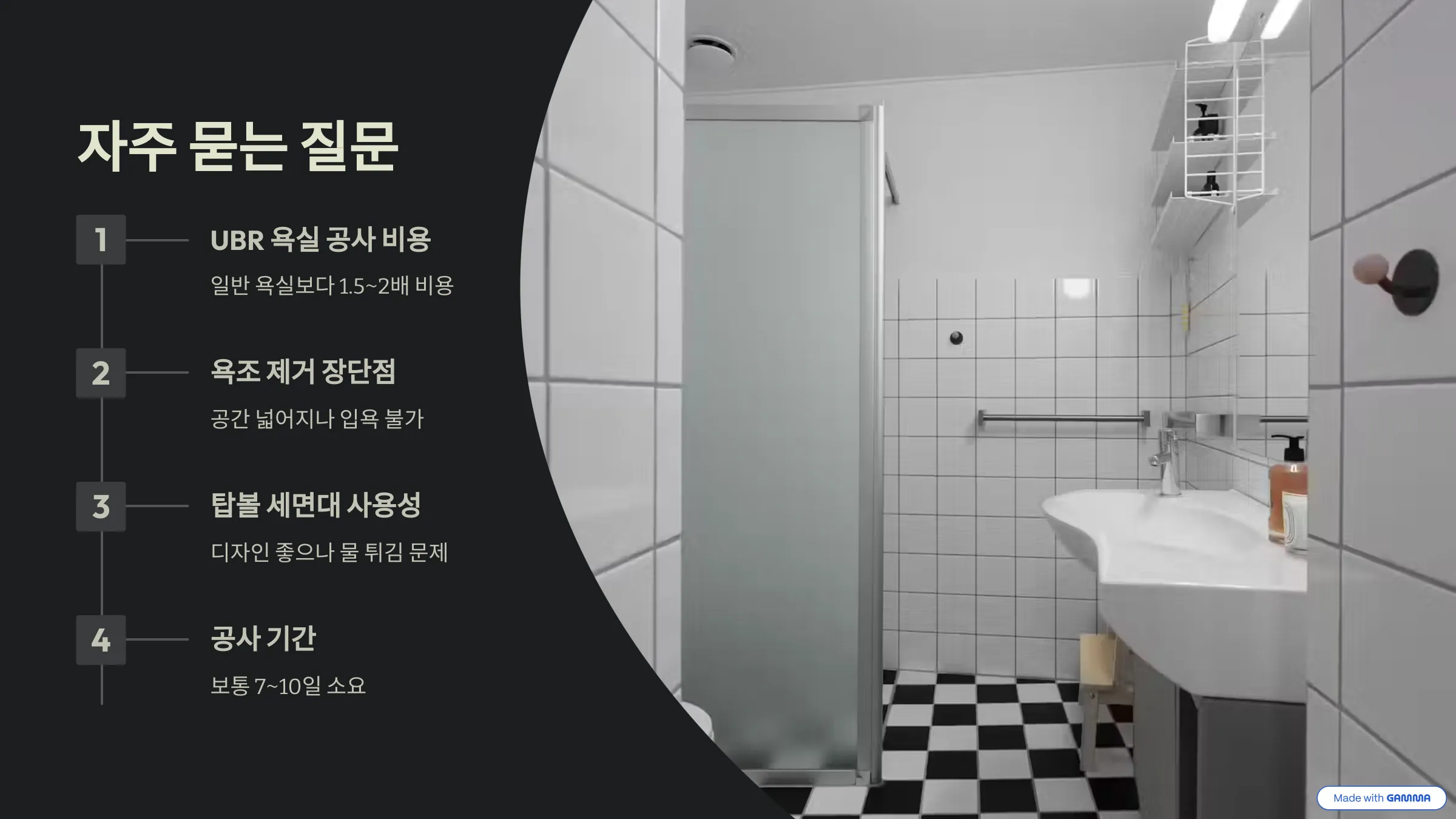 - ❌ 실수 4: 좁은 욕실에 너무 어두운 색 타일을 쓰는 것. 공간이 더 좁고 답답해 보일 수 있어요. 밝은 톤을 추천해요.