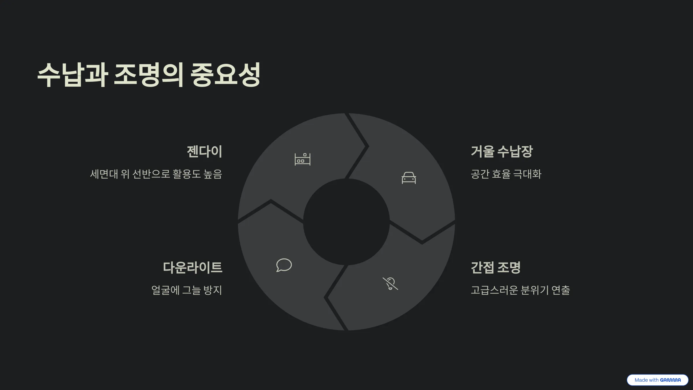 아무리 예쁜 타일과 도기로 꾸며도, 수납이 해결되지 않으면 욕실은 금세 너저분해지기 마련이죠. 조명 역시 마찬가지! 욕실의 완성도는 바로 이 디테일에서 결정됩니다.