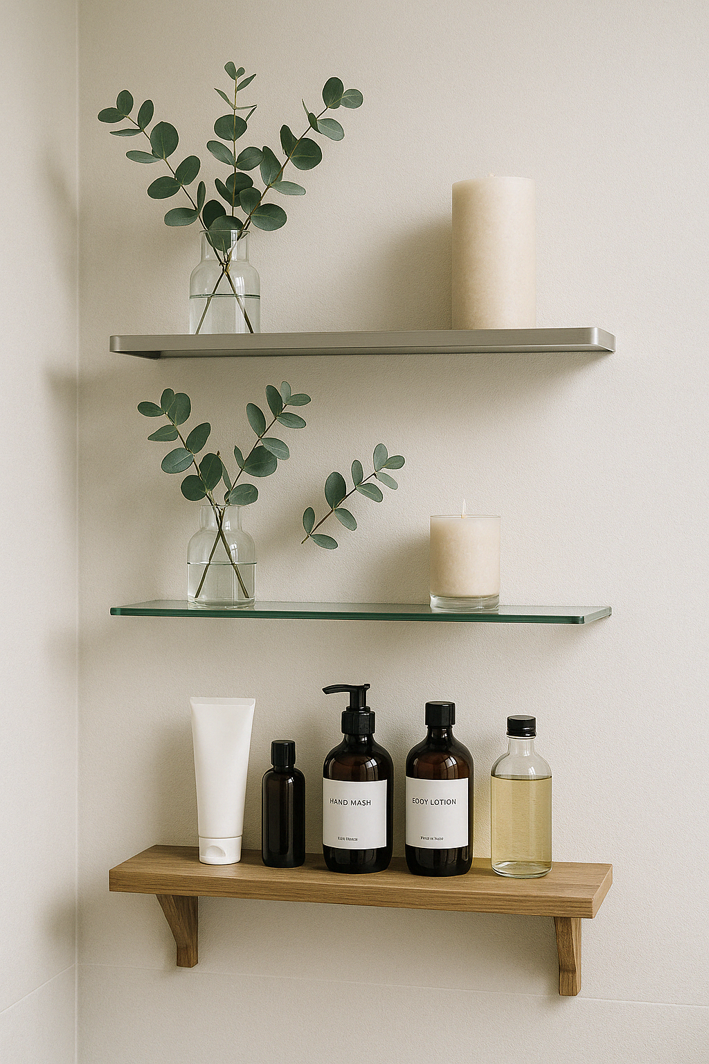 욕실은 작은 공간이 많아 수납이 늘 고민이죠. 벽면에 선반을 추가하면 공간 활용도 높아지고, 감성 아이템을 진열하는 '디스플레이 존'이 될 수 있습니다. 유칼립투스, 조명병, 향초 등을 올려보세요.