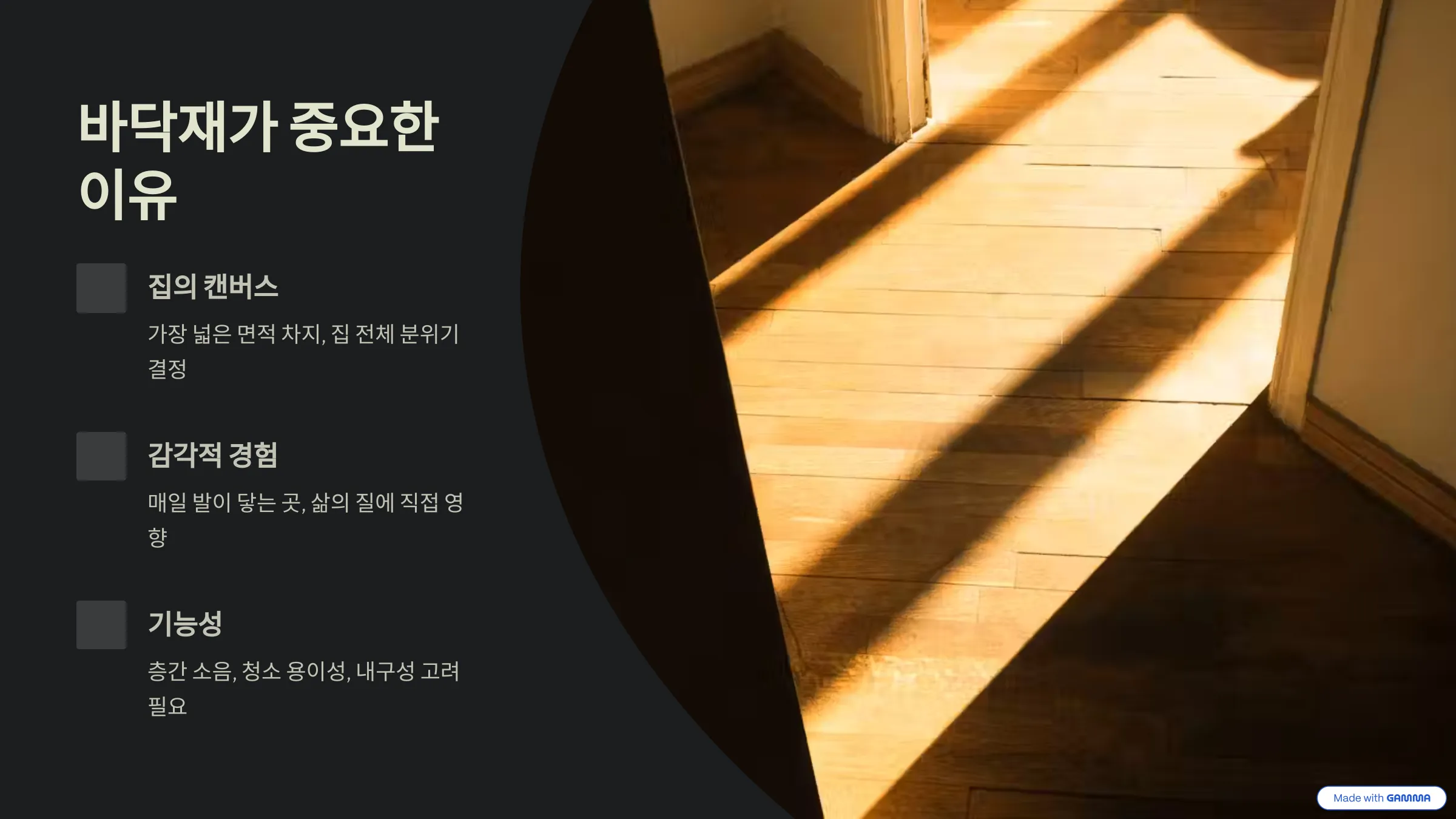 집의 컨벤션·감각적 경험·기능성 등 바닥재가 중요한 이유 시각화 이미지