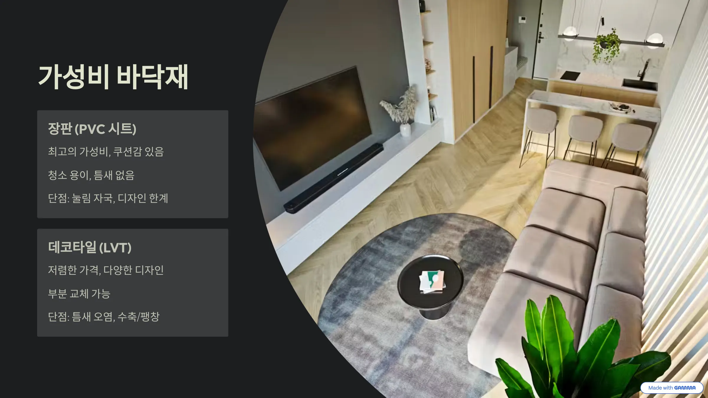 원목마루 고급스러운 질감, 편안한 보행감, 친환경적 비싼 가격, 습기 및 스크래치에 매우 취약