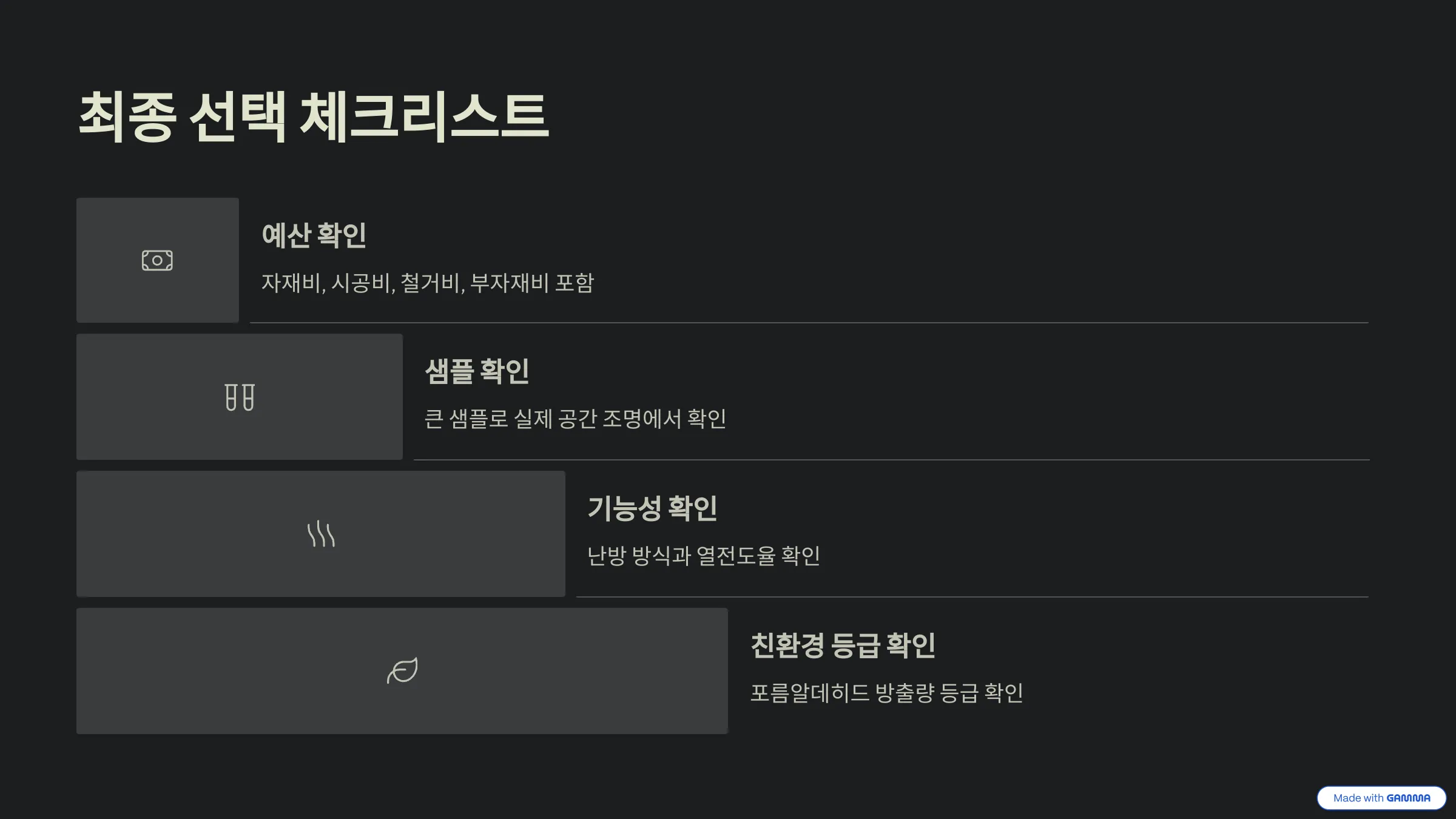 자, 이제 어떤 바닥재를 선택할지 마음의 결정이 거의 끝나셨나요? 최종 계약서에 도장을 찍기 전, 마지막으로 이 체크리스트를 꼭 확인해보세요!