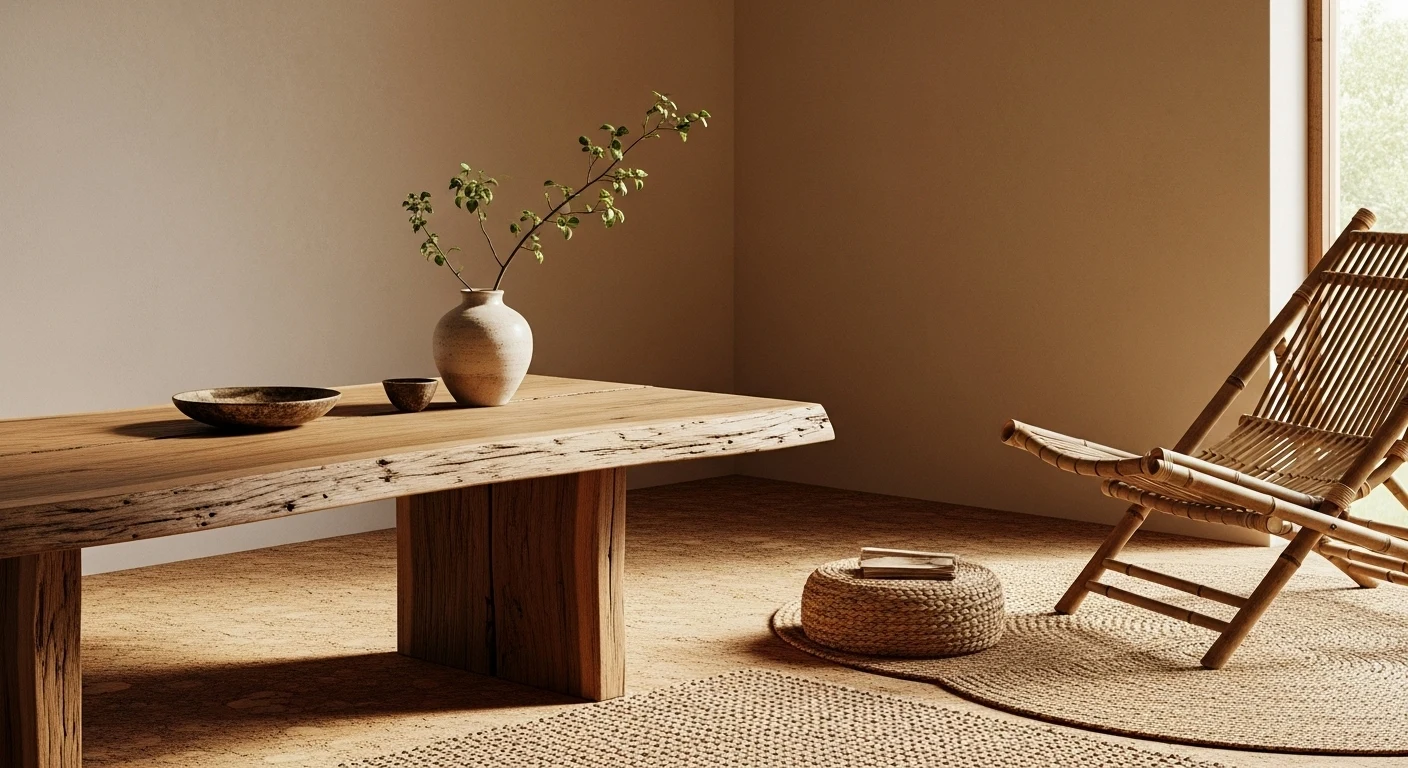 재활용 목재 가구, 천연 섬유 러그, 코르크 바닥재 등 다양한 자연 소재를 활용하여 생명력을 불어넣은 바이오필릭 인테리어.
