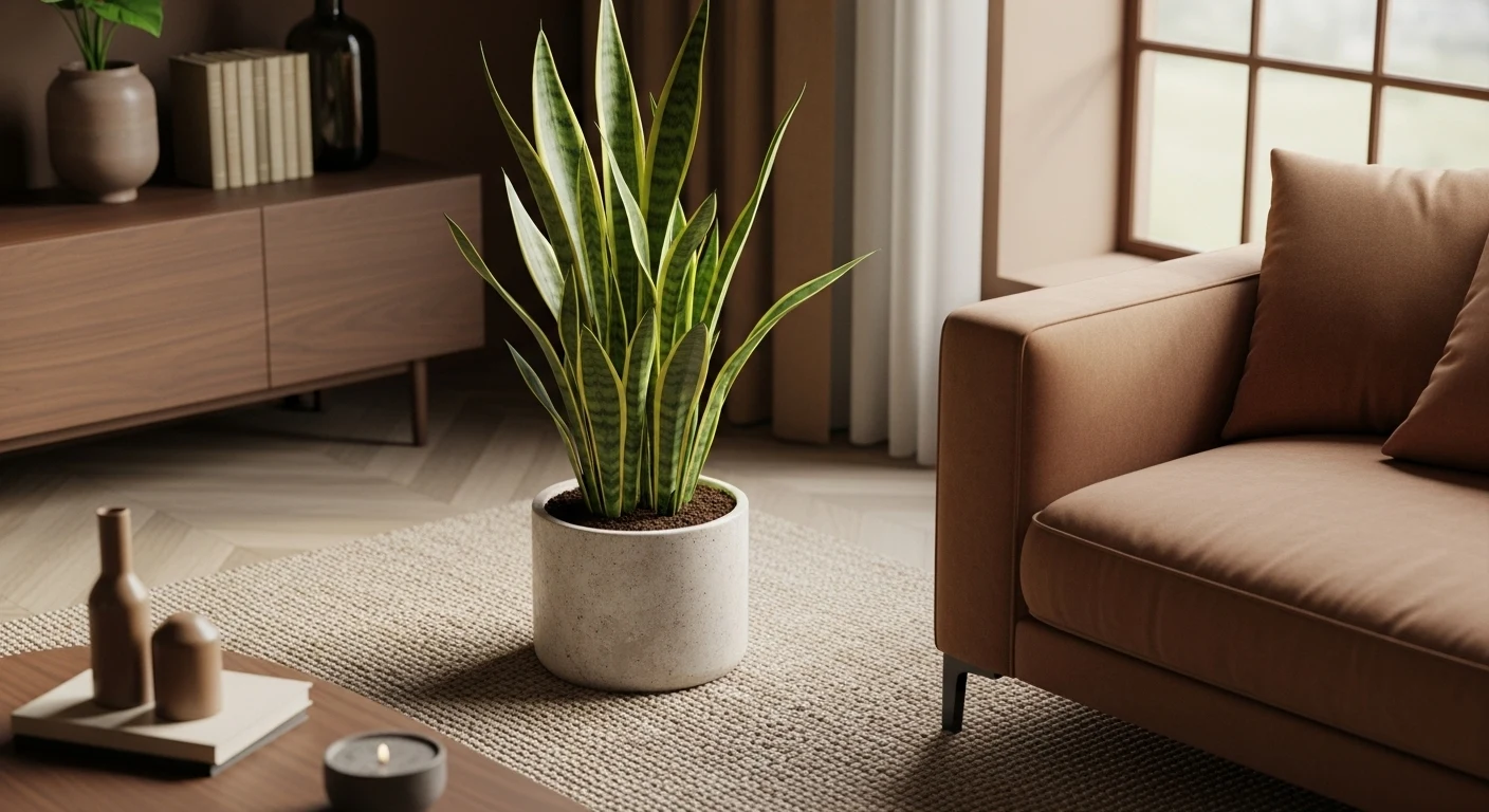 팬톤 컬러 모카무스 소파와 공기 정화 식물, 재활용 소재 가구를 활용한 2025년 바이오필릭 인테리어 트렌드.