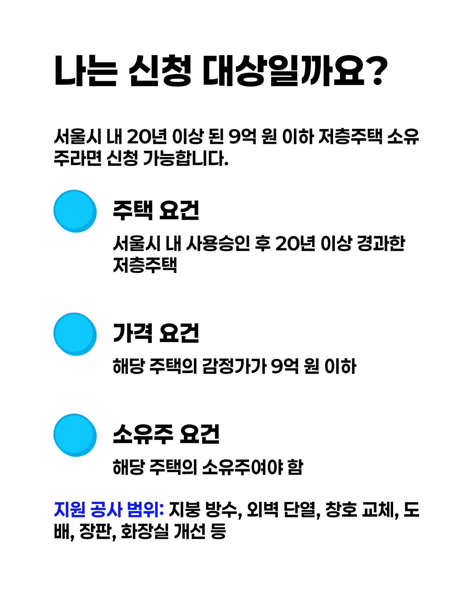 단순 인테리어나 미관 개선 목적의 공사는 지원 대상에서 제외될 수 있어요. 신청 전에 내가 하려는 공사가 지원 대상에 포함되는지 관할 자치구 담당 부서에 꼭 문의해 보세요!