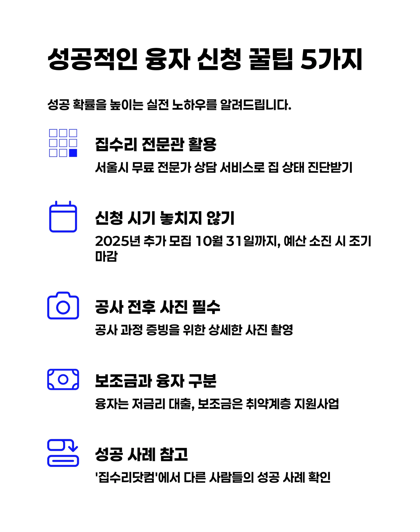 단순 인테리어나 미관 개선 목적의 공사는 지원 대상에서 제외될 수 있어요. 신청 전에 내가 하려는 공사가 지원 대상에 포함되는지 관할 자치구 담당 부서에 꼭 문의해 보세요!