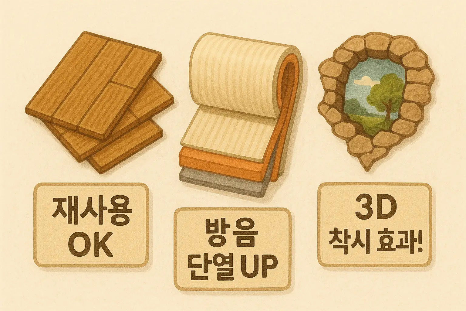 이건 바닥용이지만 벽에도 활용 가능해요. 접착제 없이 바닥의 미끄럼 방지 처리만으로 고정되는데, 정말 안 밀려요. 재사용이 가능해서 전셋집의 저주받은 체리색 바닥을 가리는 데 이만한 게 없죠. 다만, 바닥이 완벽하게 평평하지 않으면 모서리가 살짝 들뜰 수 있다는 점은 기억하세요.