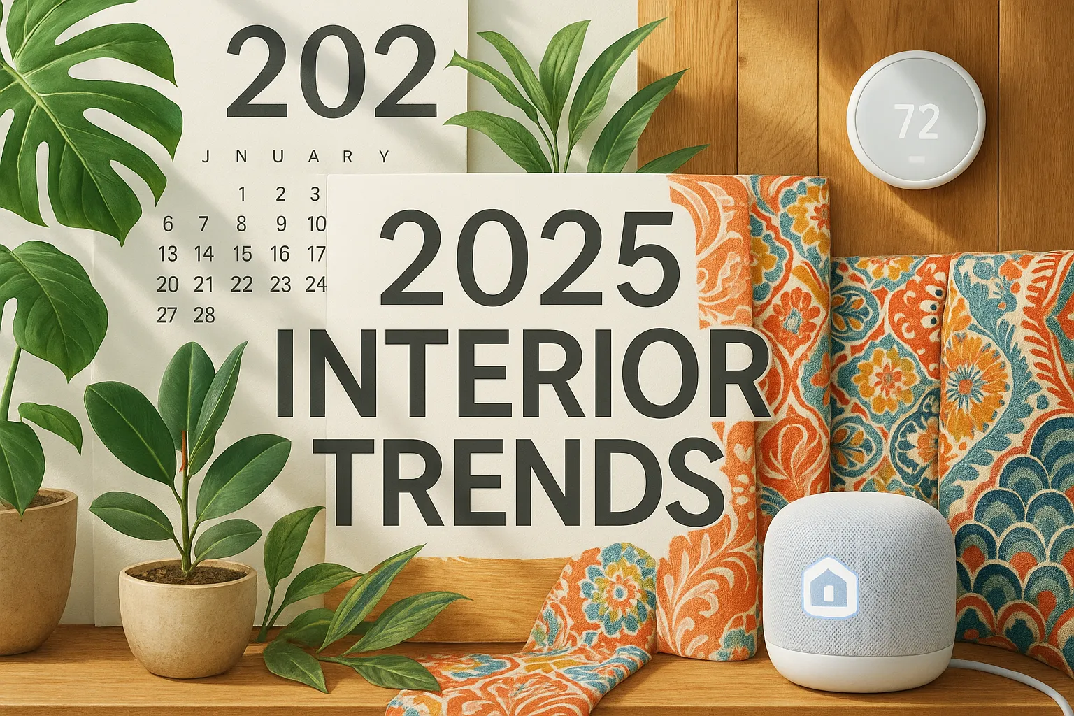 2025 인테리어 트렌드를 강조하는 식물, 패턴 천, 스마트 홈 기기가 놓인 연출
