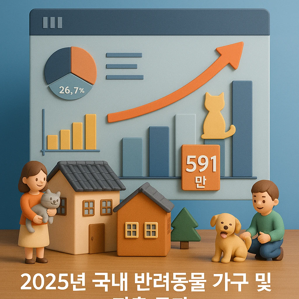 - KB금융지주 경영연구소의 '2025 한국 반려동물 보고서'에 따르면, 2024년 말 기준 국내 반려가구는 591만 가구 (전체 가구의 26.7%), 반려인 수는 1,546만 명 (총인구의 29.9%)에 달합니다.