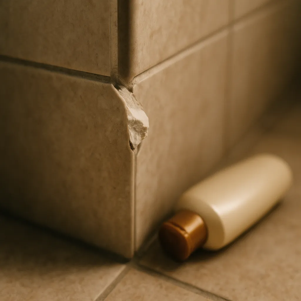 마지막 로망은 타일 모서리를 45도로 비스듬히 잘라 딱 맞추는 '졸리컷(마이커컷)' 마감이었습니다. 코너비드(쫄대) 없이 깔끔하게 떨어지는 '칼각'은 미니멀 인테리어의 상징이었죠. 하지만 어느 날, 아이가 선반에서 샴푸통을 떨어뜨렸는데 하필 졸리컷 모서리에 부딪혔습니다. 날카로운 타일 끝부분은 여지없이 '이가 빠졌고', 부분 수리가 안 된다며 벽면 일부 재시공 견적 80만 원을 받았습니다. '80만 원짜리 샴푸통'의 비극이었죠.