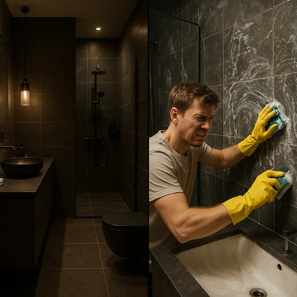 어두운 무광 표면은 아이러니하게도 작은 얼룩조차 용납하지 않고 오히려 돋보이게 만듭니다. 특히 한국처럼 경도가 높은 수돗물 환경에서는 물이 마르면서 미네랄 자국(물때)이 하얗게 남기 십상이죠. 여기에 비누때, 머리카락까지 합세하면 그야말로 '얼룩 파티'가 열리는 겁니다.
