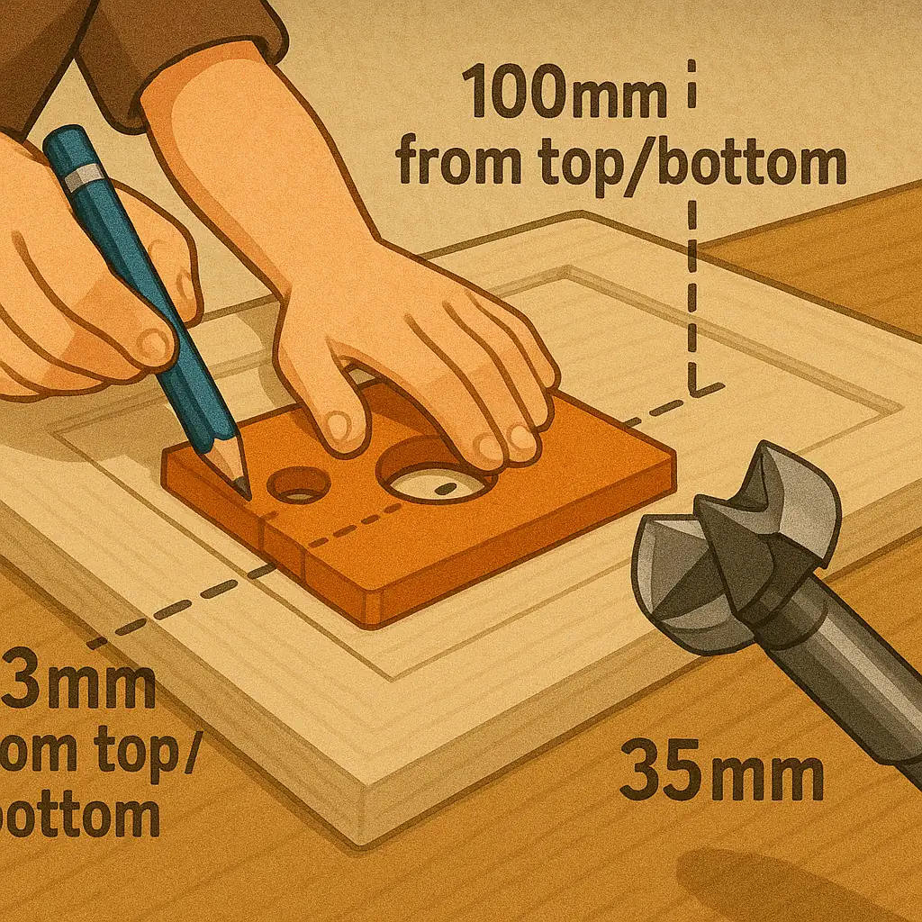 표준 규격은 보통 문짝 가장자리에서 23mm, 위아래에서 100mm를 띄워서 표시해요. 이 숫자만 기억해도 절반은 성공입니다.