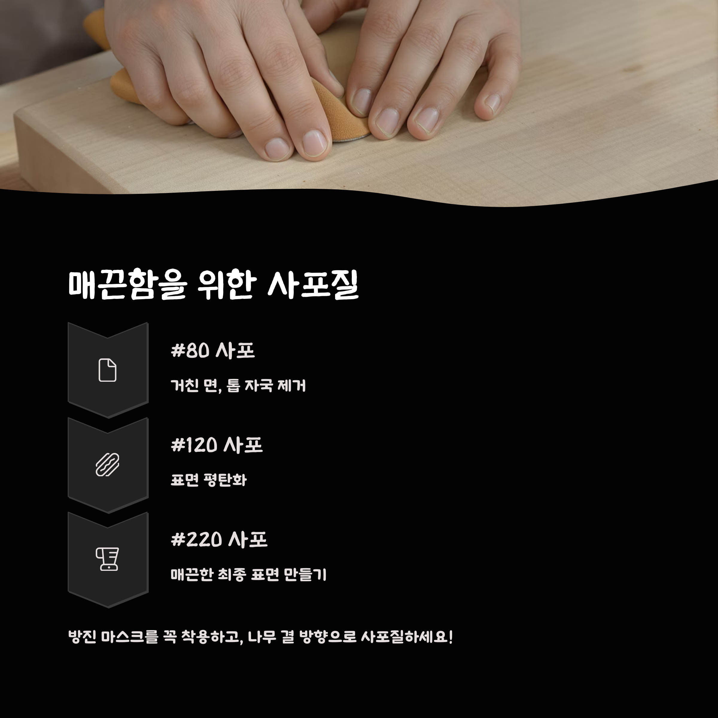 이제 거친 나무 표면과 날카로운 모서리를 부드럽게 다듬을 차례입니다. 사포질(샌딩)은 완성도를 높이는 중요한 과정이니, 정성을 들여 작업해 주세요. 사포는 숫자가 낮을수록 거칠고(#80), 높을수록 곱습니다(#220 이상).