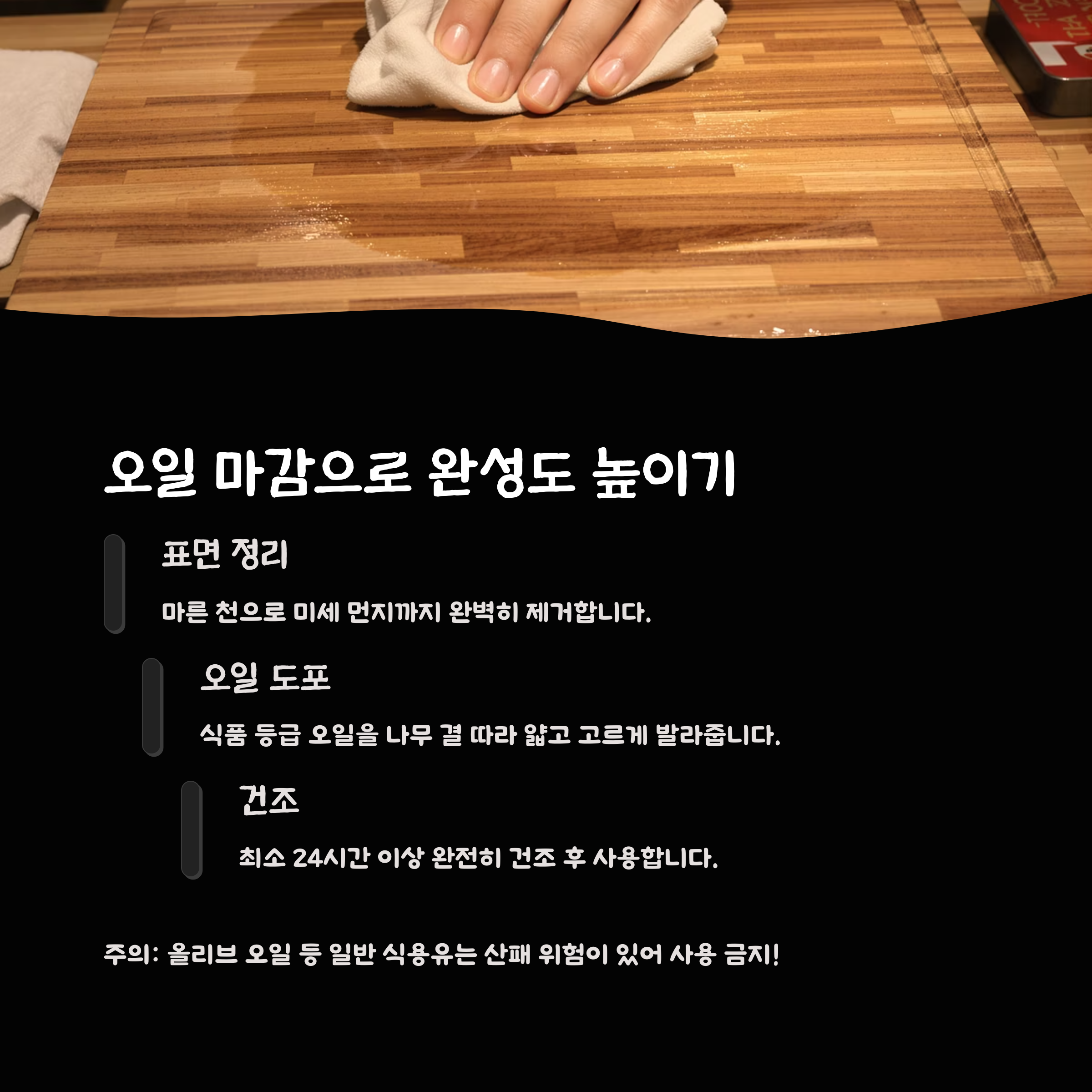 - 닦아내기: 마른 천으로 남은 오일을 깨끗이 닦아냅니다. 끈적임이 없도록!