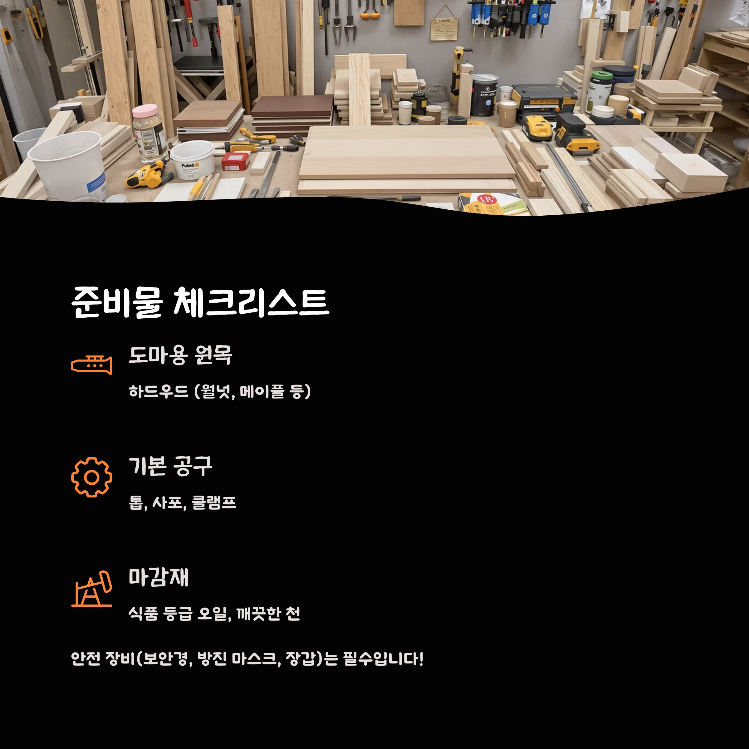 자, 이제 도마를 만들 재료와 도구를 준비해 봅시다. 아래 표를 보고 빠짐없이 챙겨주세요. 안전 장비는 필수입니다!